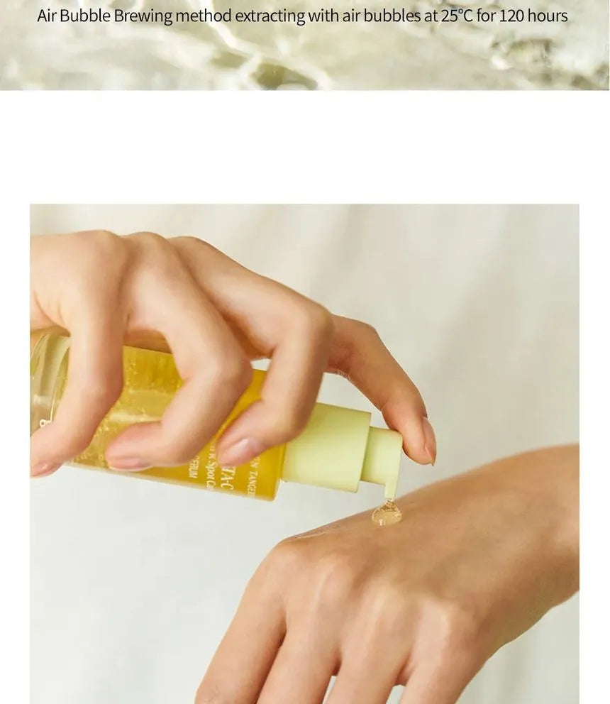 El suero hipoalergénico repleto de un 70 % de vitamina C del extracto de mandarina verde minimiza la aparición de imperfecciones y manchas oscuras.